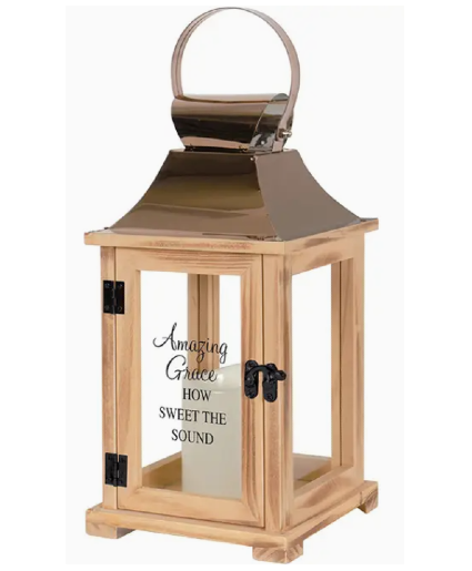This lantern is made from quality wood and a stainless steel copper finish top. It features a built-in automatic timer which runs for 6 hours on and 18 hours off(3-AAA batteries are NOT included) and is uv printed with a sentimental quote. DO NOT use fire burning candles in the lantern. Suitable for hanging or free-standing use inside. Recommended as an accent in floral arrangements for many occasions! W: 6.25"H: 13.5"D: 6.25"